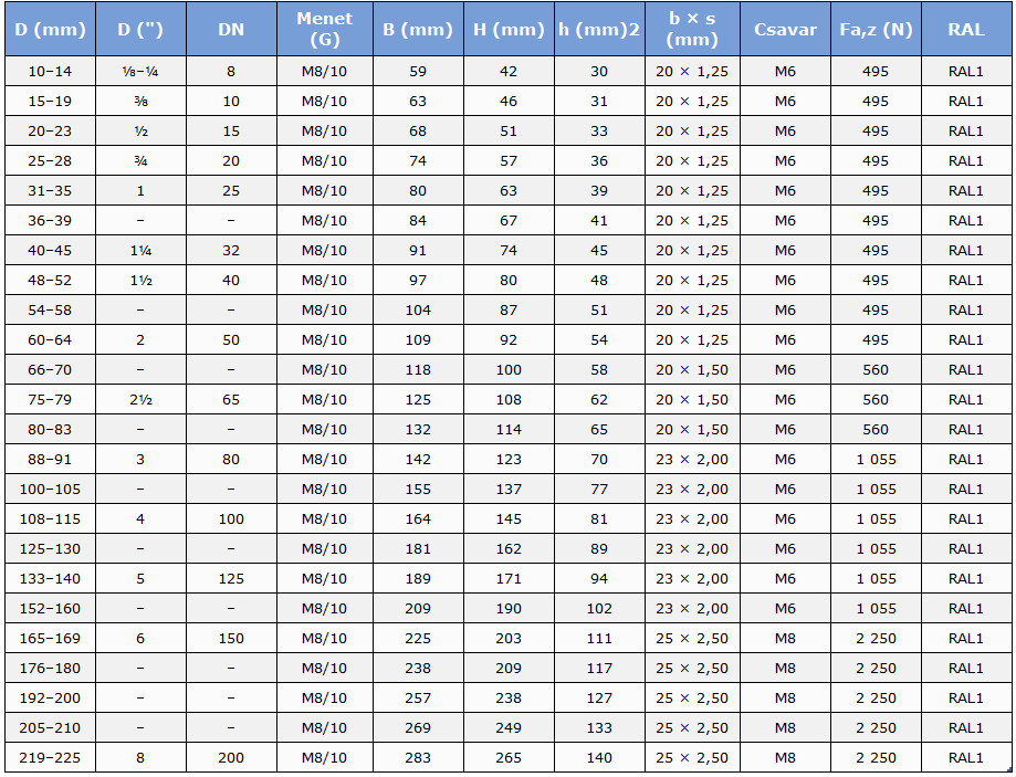 Acél alapanyagból készül, elektrolitikus horganyzott felületvédelemmel, amely biztosítja a korrózióállóságot és a hosszú élettartamot. A csőbilincs –30 °C és +120 °C közötti hőmérséklet-tartományban megbízhatóan alkalmazható.
