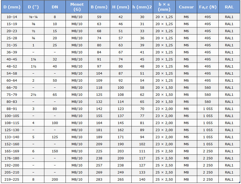 Acél alapanyagból készül, elektrolitikus horganyzott felületvédelemmel, amely biztosítja a korrózióállóságot és a hosszú élettartamot. A csőbilincs –30 °C és +120 °C közötti hőmérséklet-tartományban megbízhatóan alkalmazható.